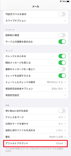 iPad の標準のメール機能以外のアプリでメールを送信する際に、デフォルトアカウントに設定したメールアドレスからメールが送信されます。