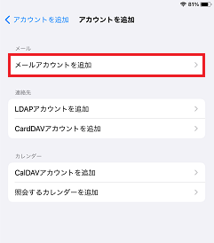 表示された画面から「アカウントとパスワード」「パスワードとアカウント」「メール」もいずれかを選択のうえ、「アカウントを追加」を選択します。
