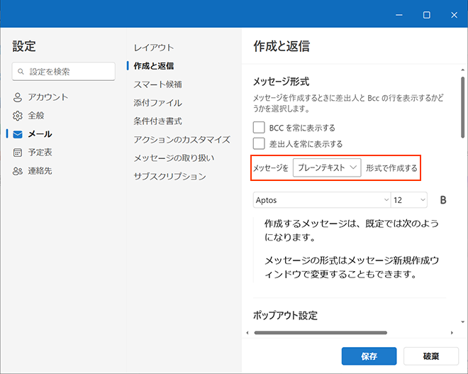 STEP2 「メール」→「作成と返信」を選択し、メッセージ形式を「プレーンテキスト」に変更します