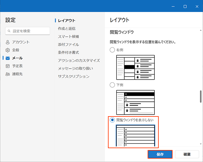 表示された画面で「閲覧ウィンドウを表示しない」を選択のうえ、「保存」を押します。