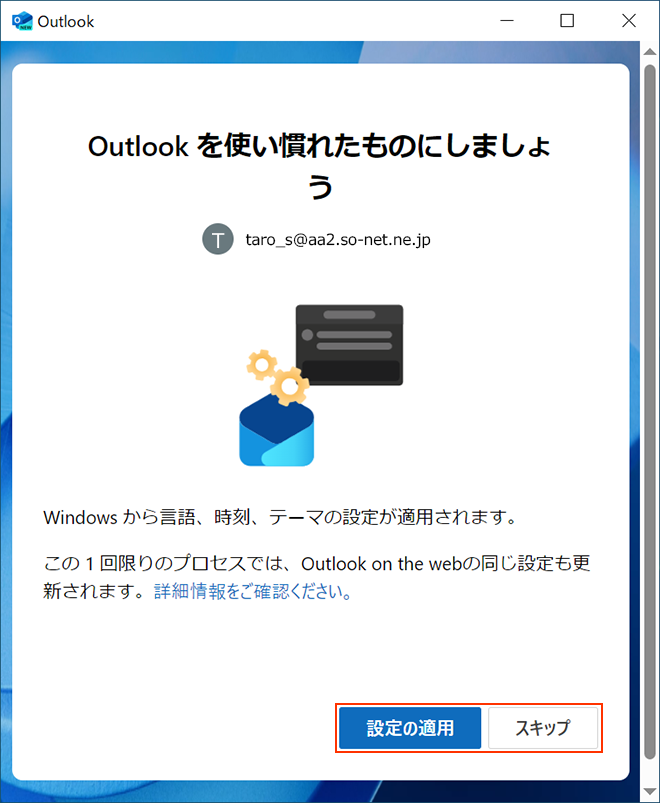 ここで「設定の適用」をご選択いただくと、Windows での使用言語などの設定が引き継がれます。