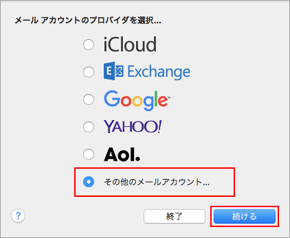 STEP2 「その他のメールアカウント...」を選択し、「続ける」を選択します