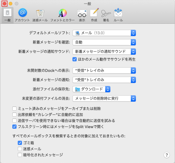 ここでは、例として macOS 10.15 にインストールされているメール 13.x でメール設定の確認方法をご案内いたします。