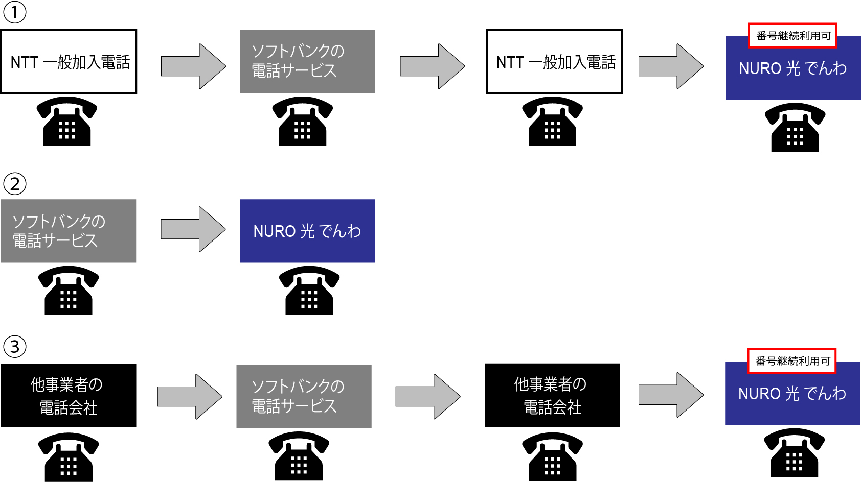 - ② 発番元が ソフトバンクの電話サービスの場合は、電話番号の移行時に数日間お電話がご利用いただけない期間がございます。新規発番でお申込みいただくことも可能です。