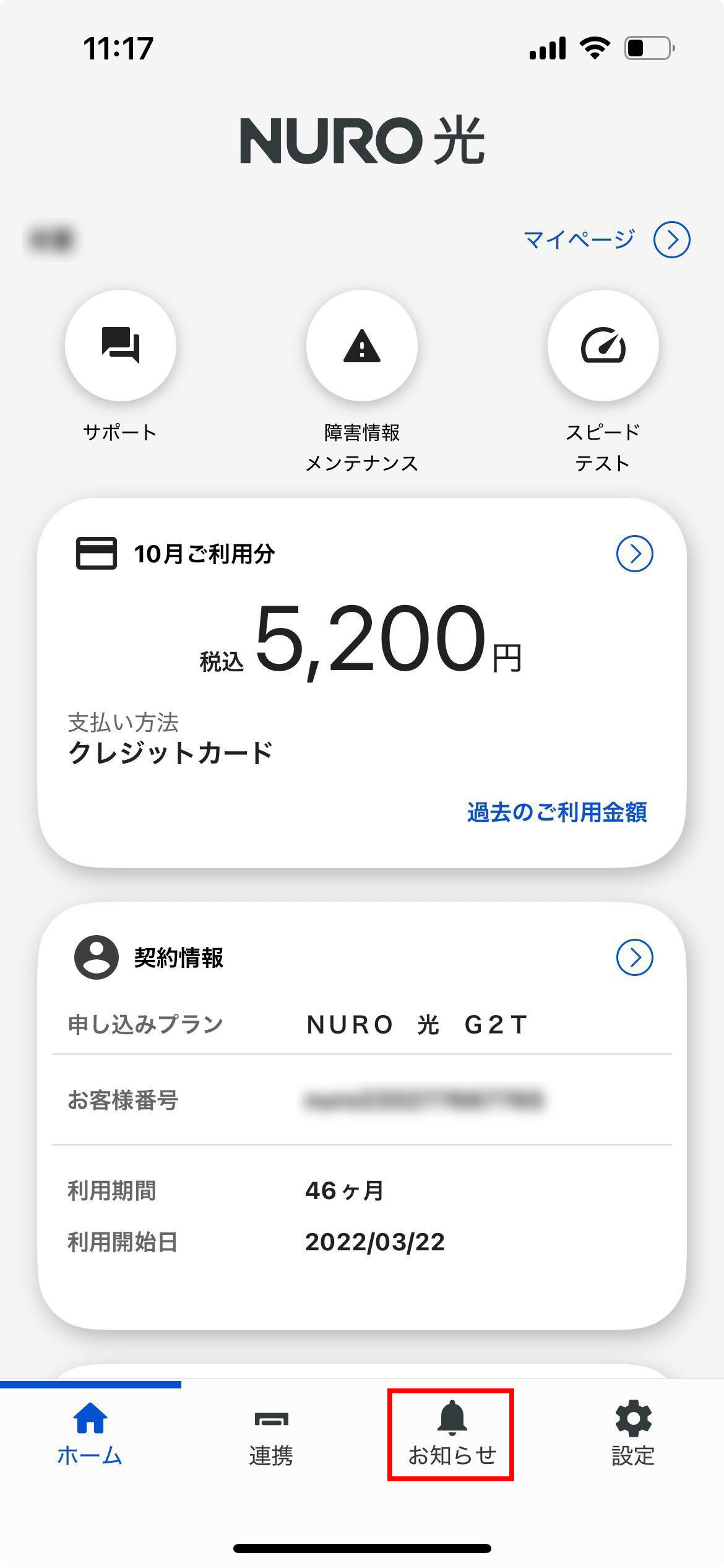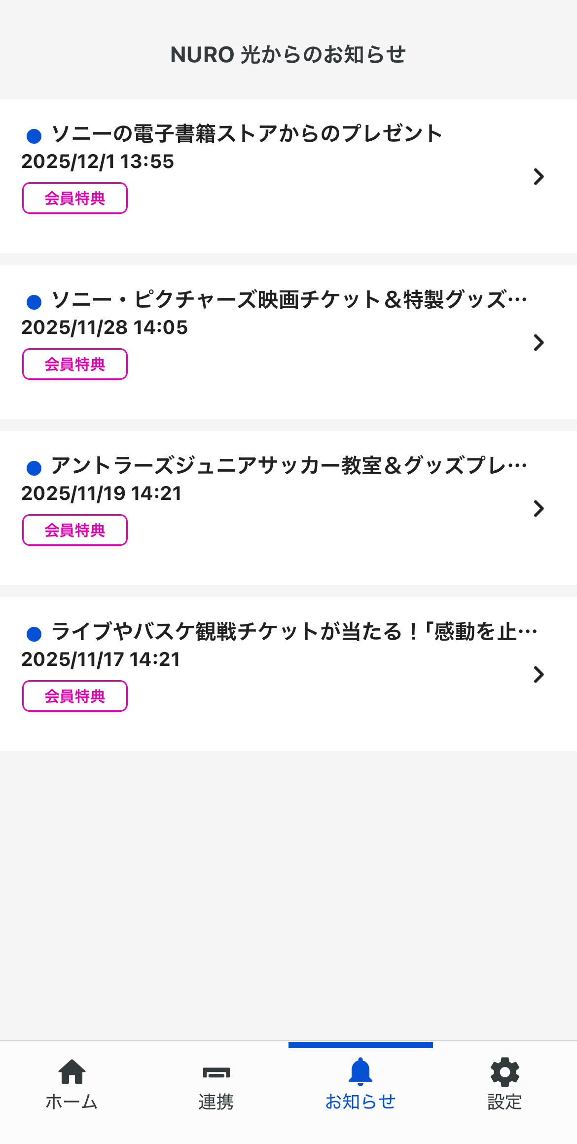 NURO 光アプリホーム中央下部の「お知らせ」よりお得な特典等をご確認いただけます。