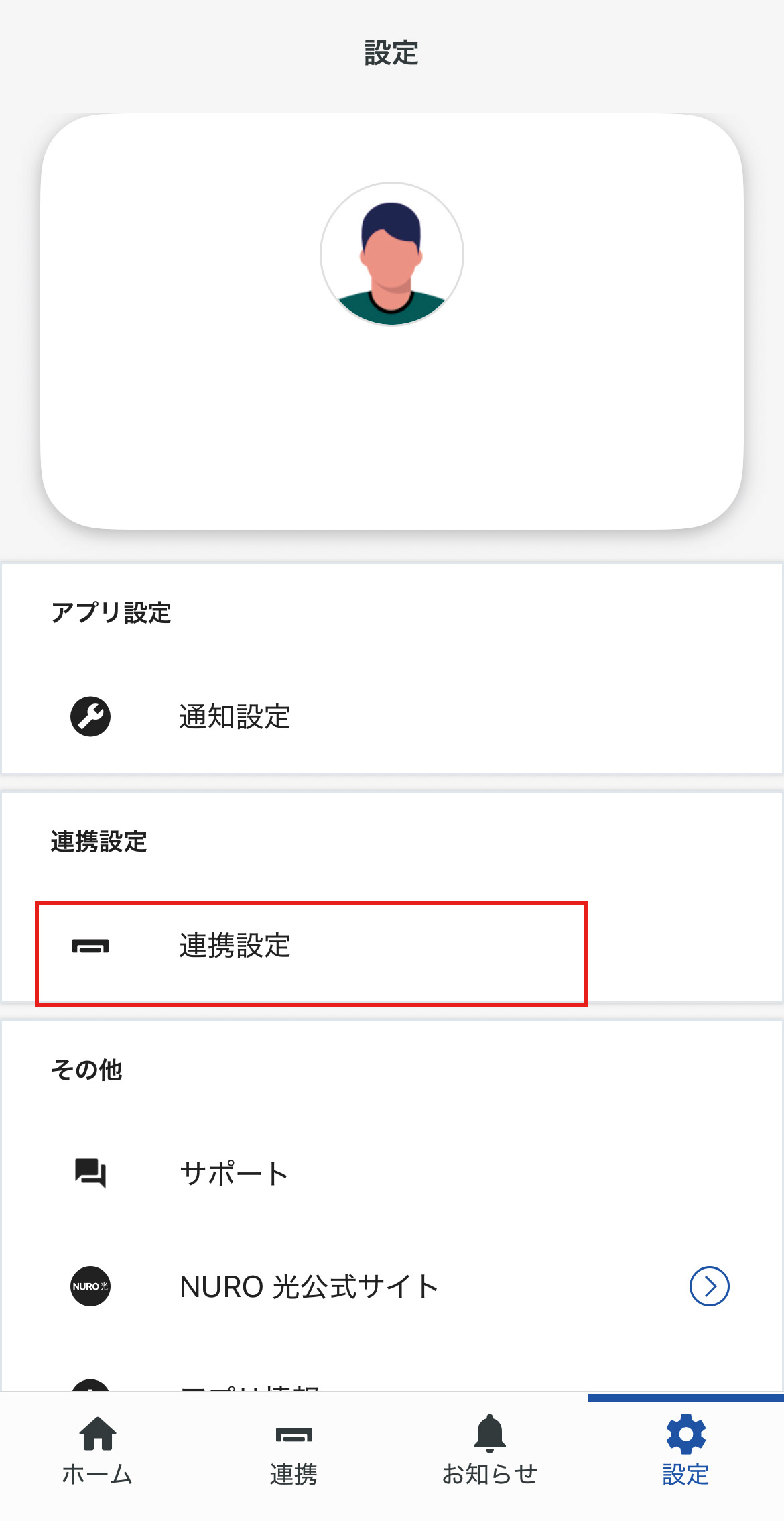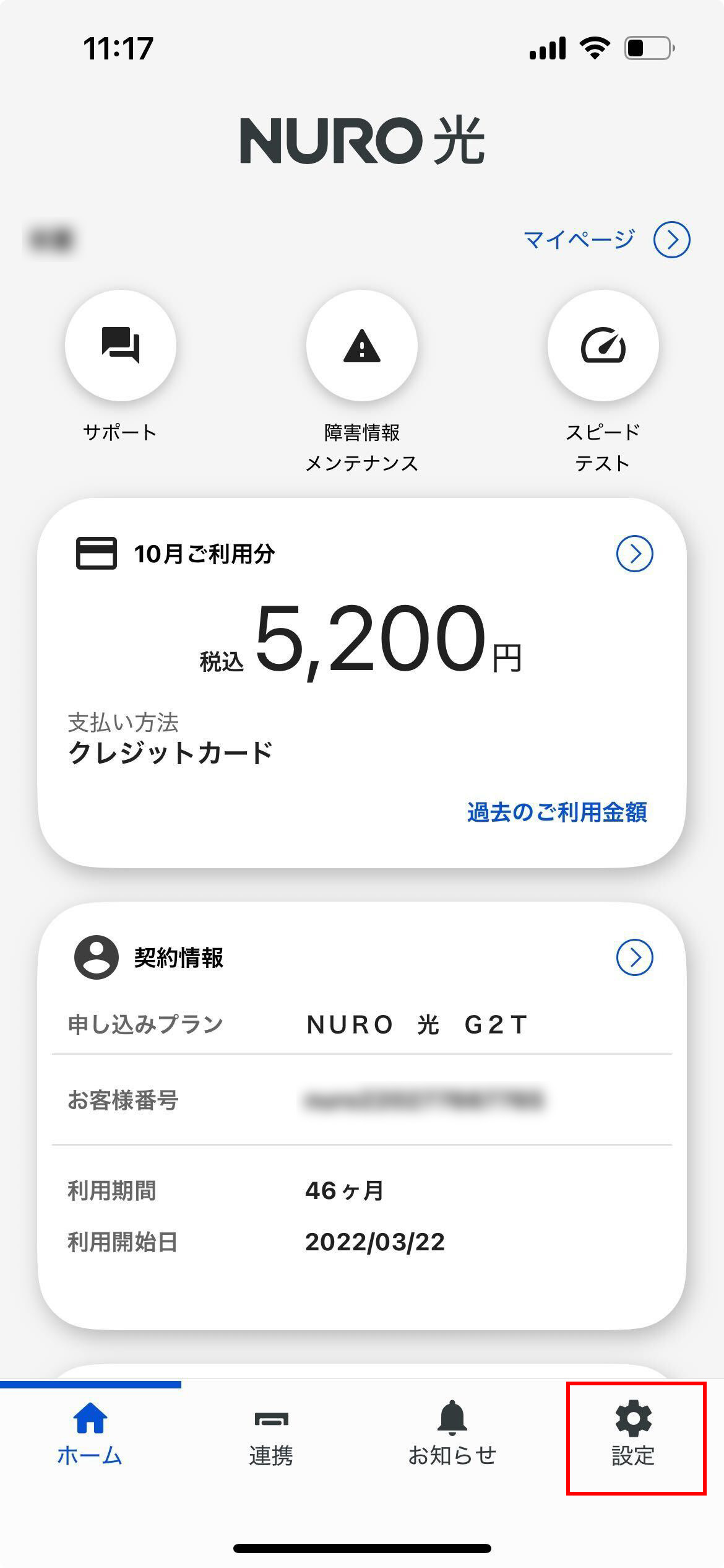 STEP1 NURO 光アプリホーム画面右下の「設定」ボタンをタップします