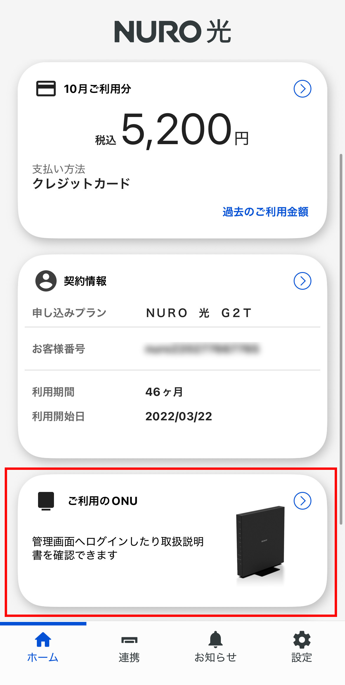 STEP1NURO 光アプリホーム画面より「ご利用のONU」をタップします