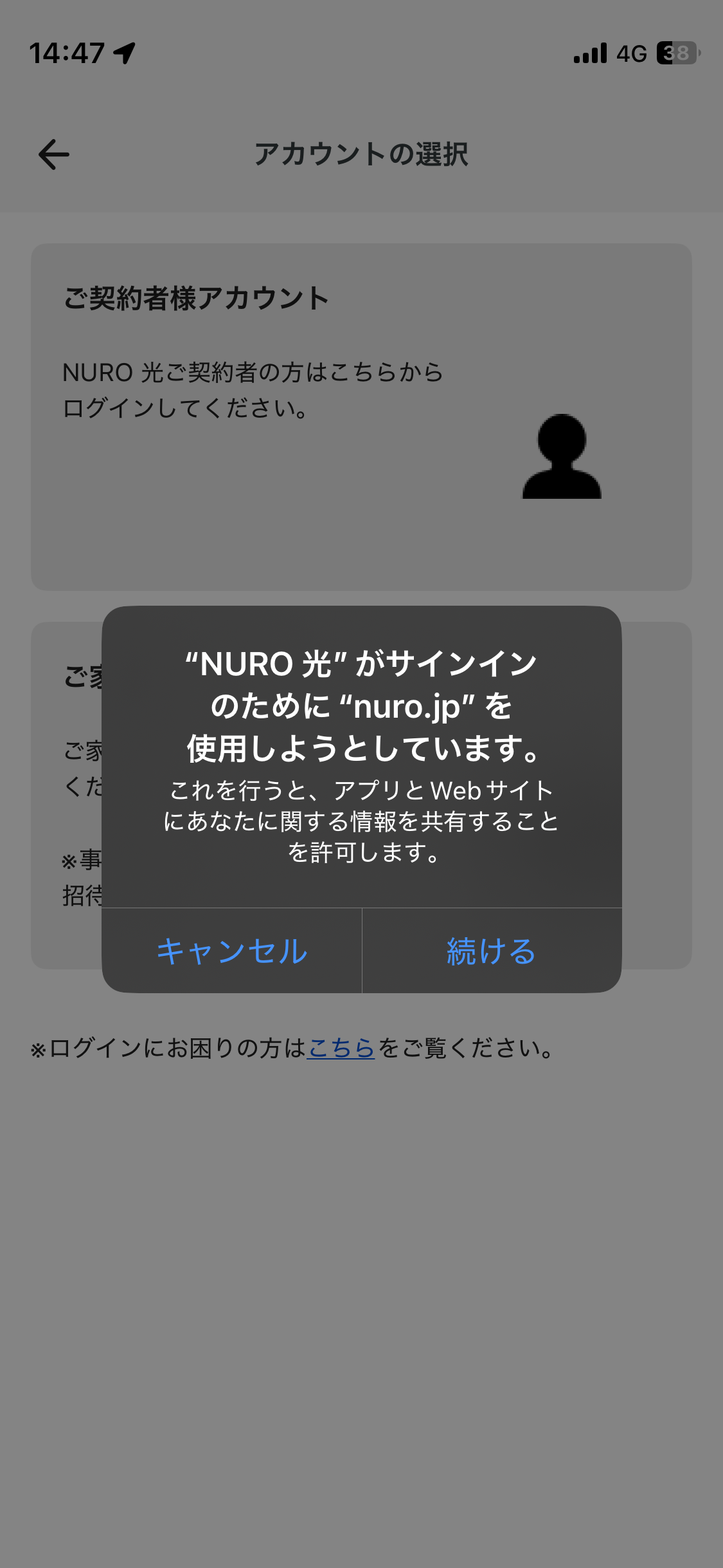 「"NURO 光" がサインインのために"nuro.jp"を使用しようとしています。」とでてきたら、「続ける」をタップしてください。