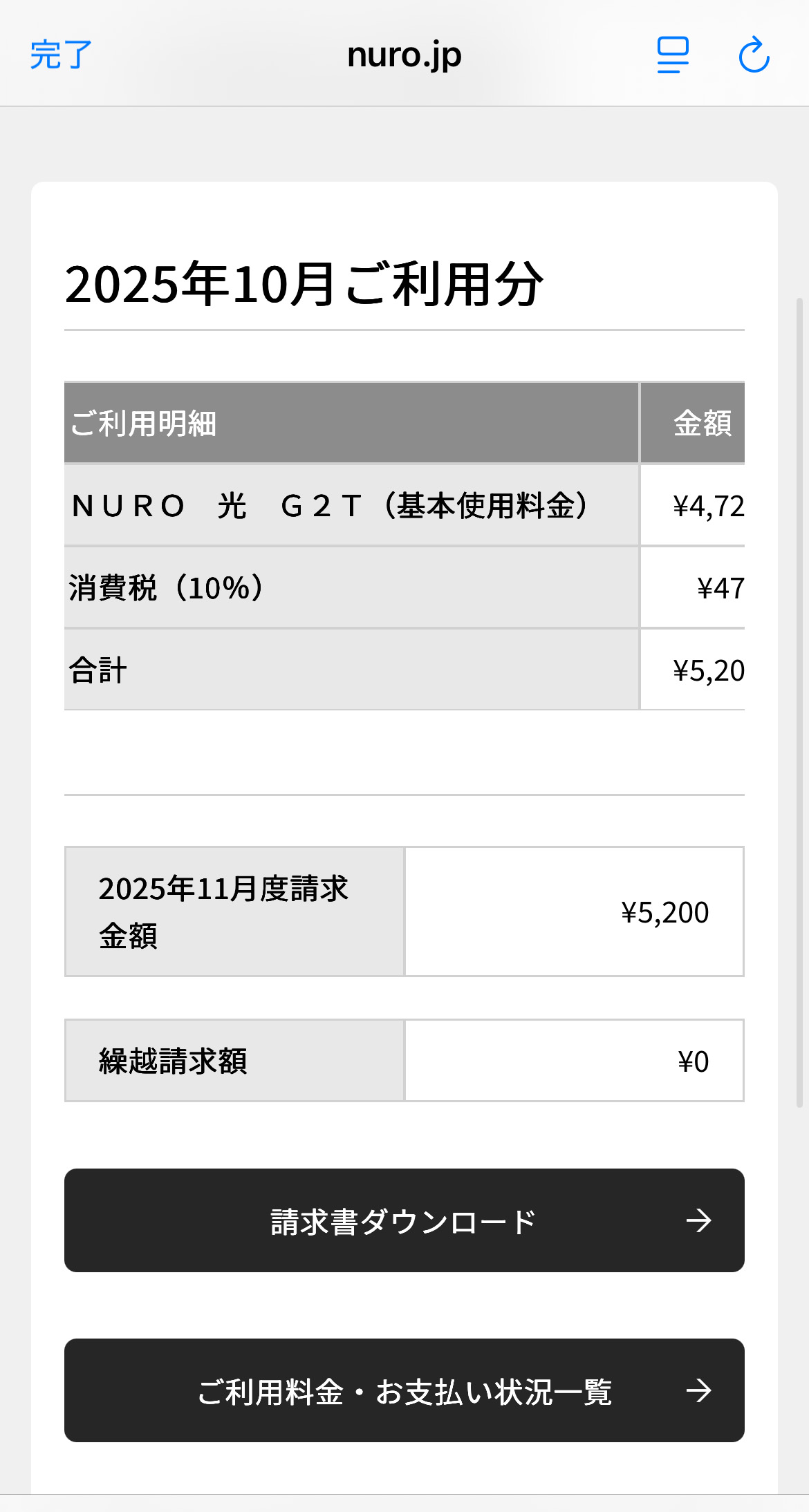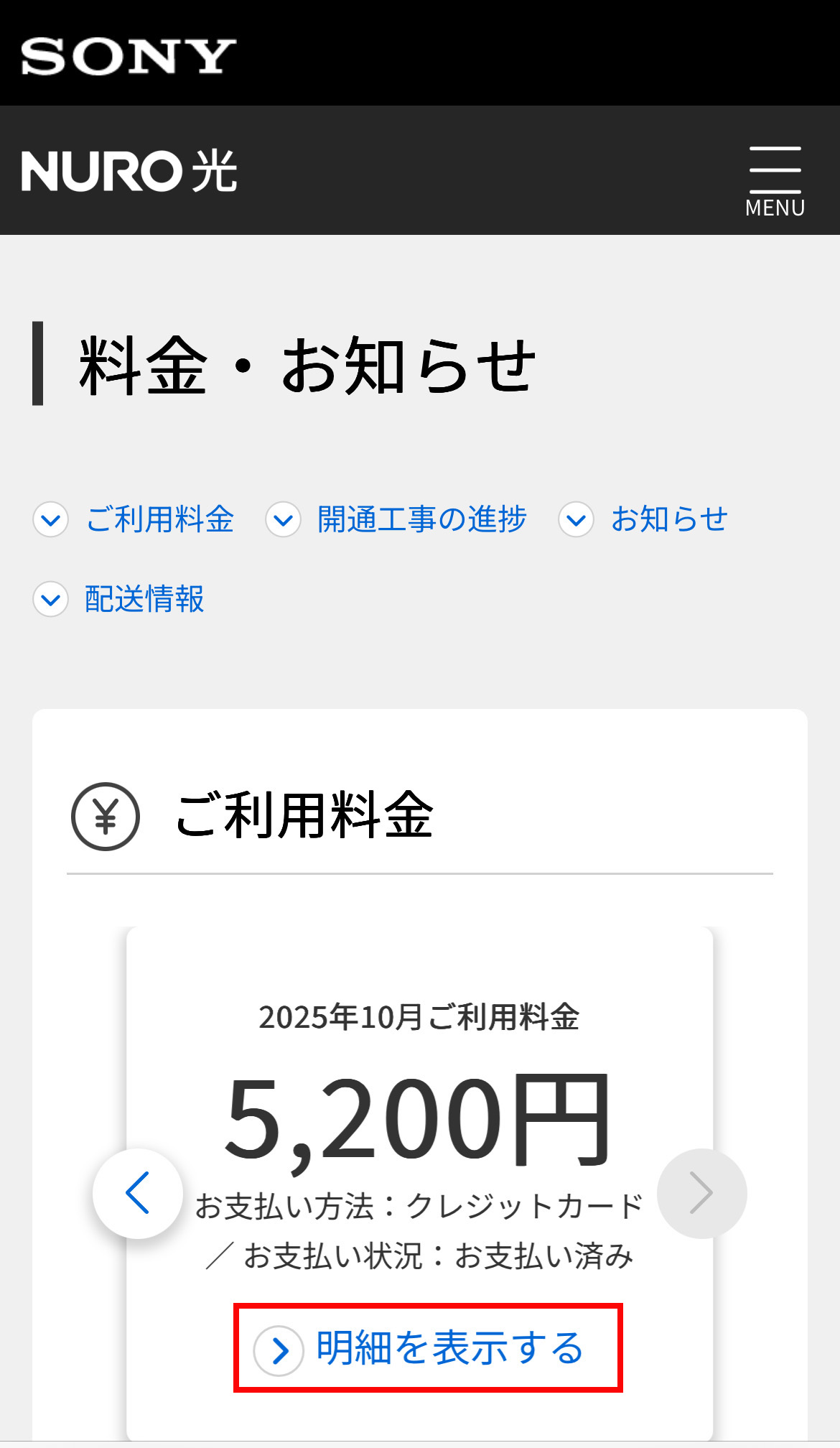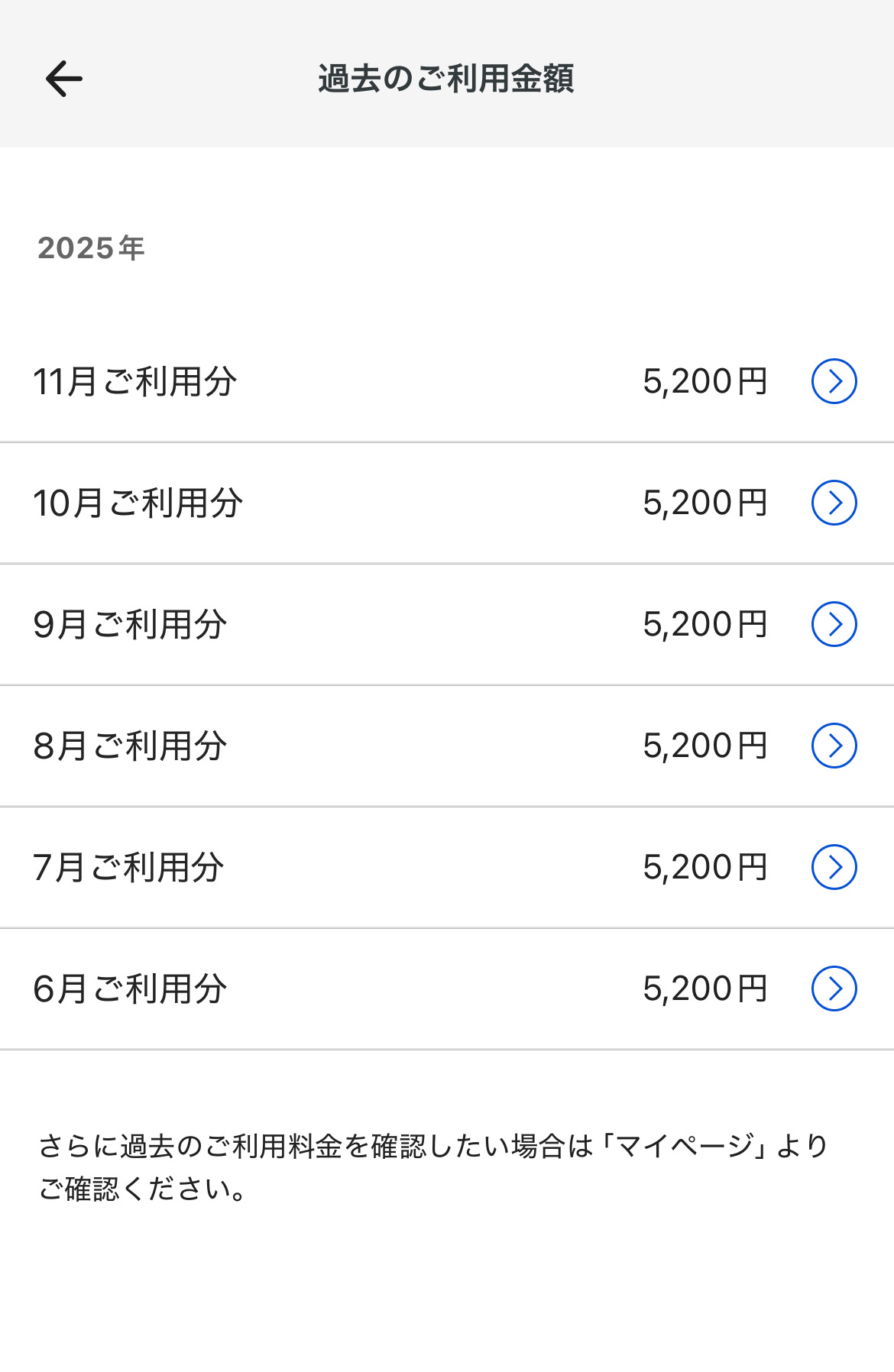 ご利用料金の詳細や過去のご利用金額を確認する場合は、「●月ご利用分」のボタンをタップします。