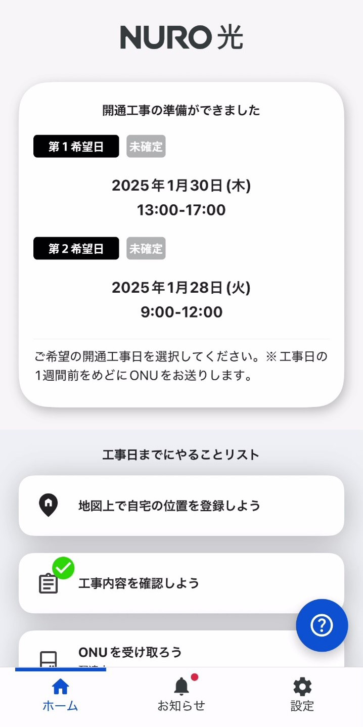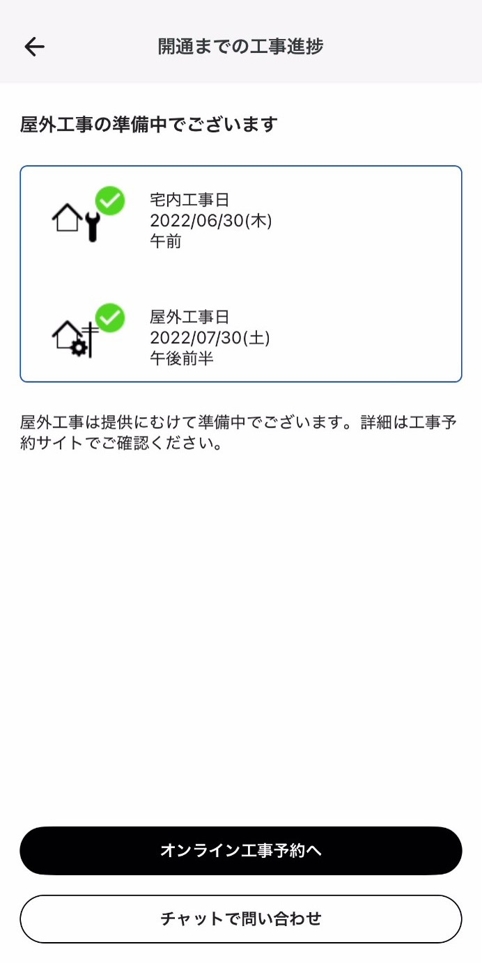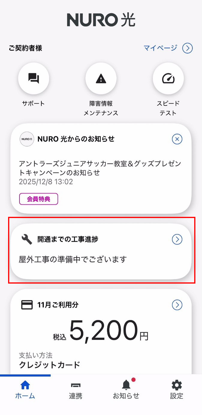 NURO 光アプリホーム画面より、「開通までの進捗」をタップすると開通工事の進捗状況をご確認いただけます。